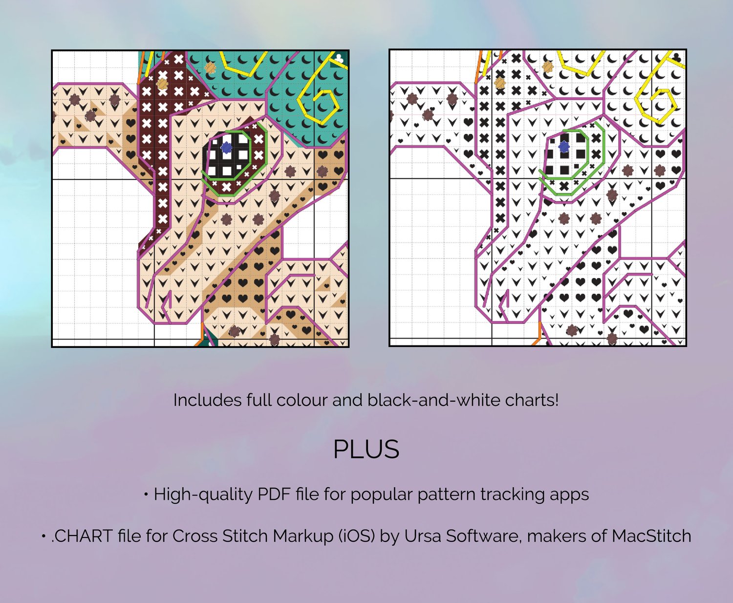 The PDF includes both full-colour and black-and-white versions of the pattern, as well as a colour key and estimated floss amounts. You can also import the PDF into your favourite cross stitch markup app to track your progress! For beginners, a thorough visual guide of all the basic stitches and techniques you'll need has been included.
