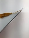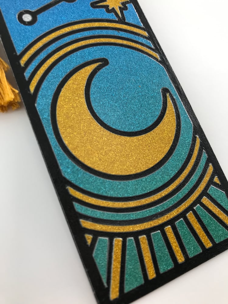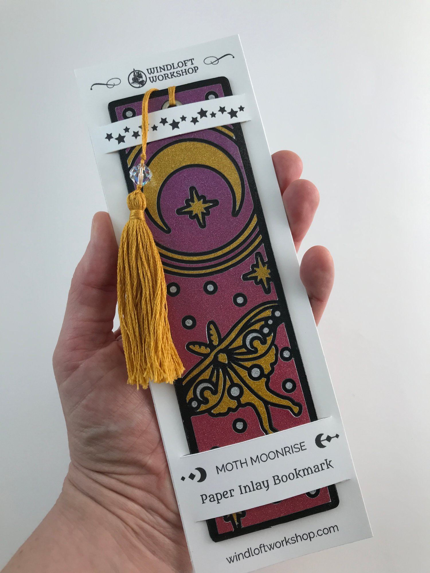 Mark your place with this beautiful 2" x 7" magical-themed bookmark, featuring a crescent moon, a sparkly luna moth and glittering stars. Made from glittery, metallic and jewel-toned cardstock using a paper inlay technique, then sealed for durability, this bookmark has multiple layers of thick cardstock for a lovely, substantial feel in hand. The back finish feels almost like faux leather! It includes a hand-tied tassel made from 100% cotton, complete with shiny acrylic charm. Best of all, the glitter is sealed in the paper surface, meaning no stray glitter escaping into your home OR the environment!