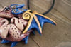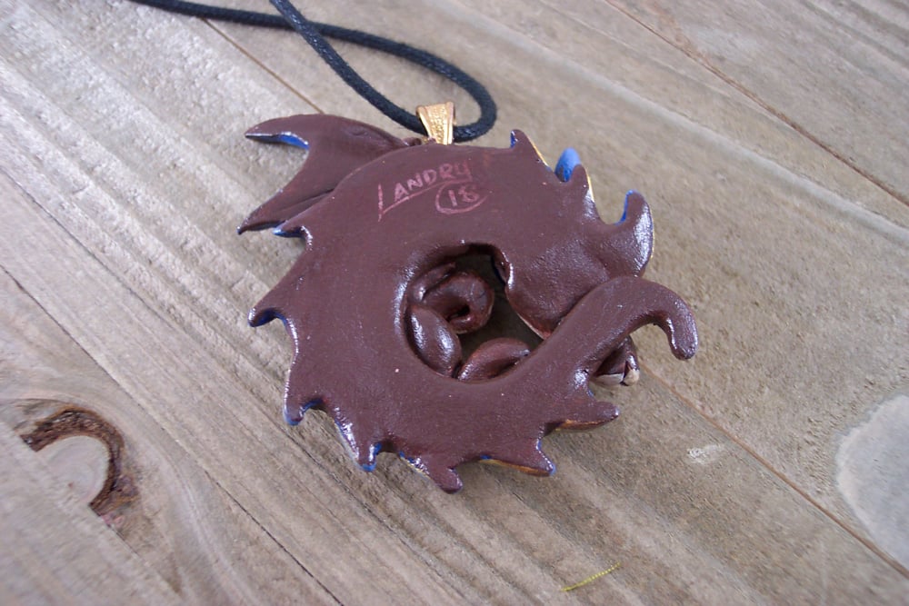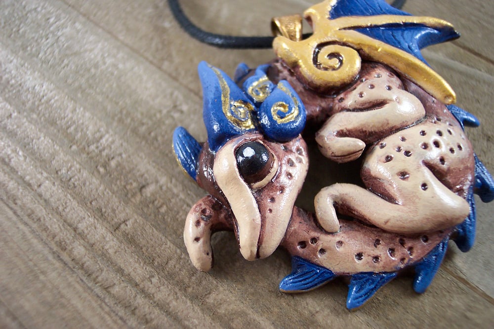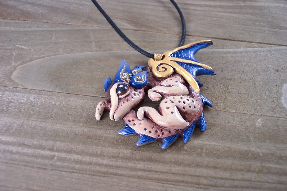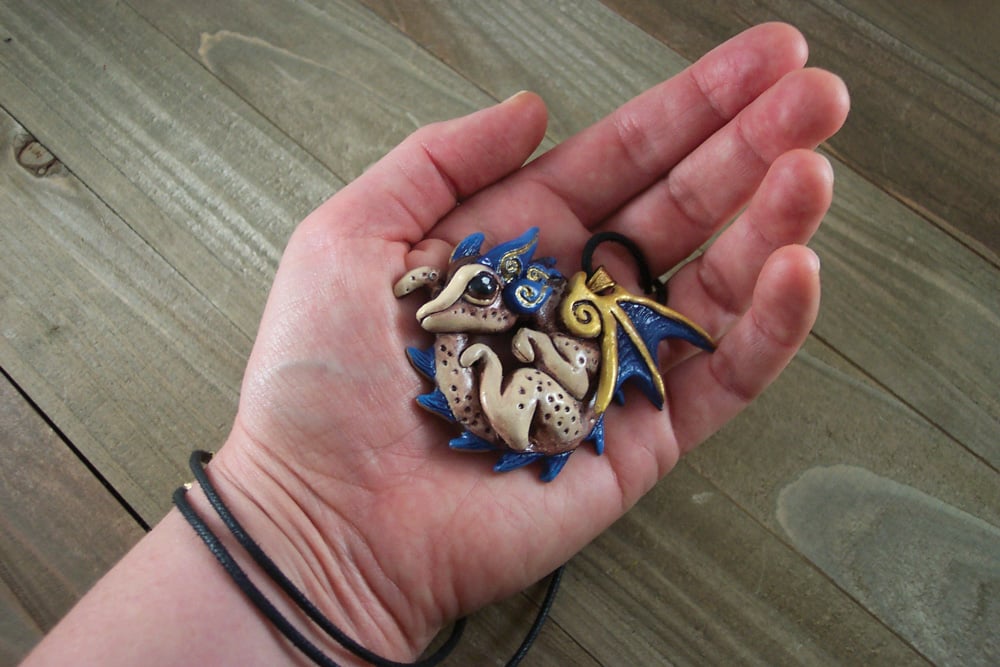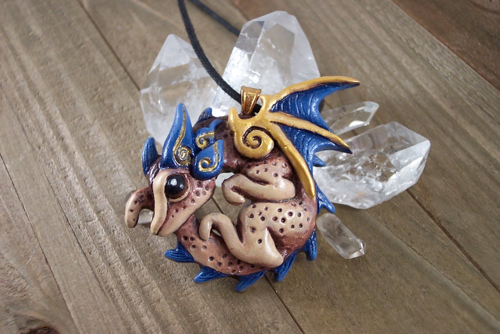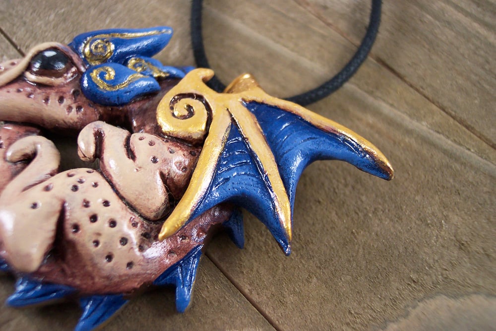 An adorable coiled baby dragon pendant, meticulously painted in antiqued beige and sapphire blue, with metallic gold accents—it's a perfect addition to any dragon lover's attire!