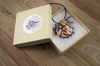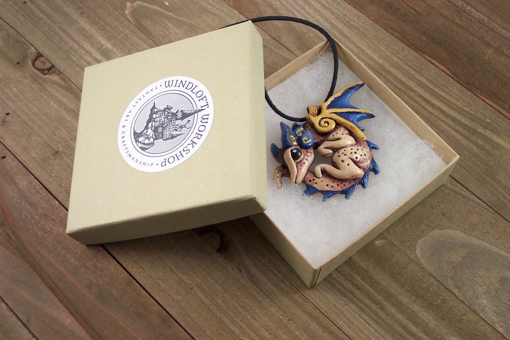 Made from polymer clay, with a black, waxed cotton cord (in a choice of lengths), and a matching metal lobster clasp, cord ends and decorative bail. The pendant has been sealed to enhance its colours and provide some resistance to water, sunlight and wear. It comes safely packed in a padded, kraft brown gift box, with a care instruction card—perfect for gift-giving!